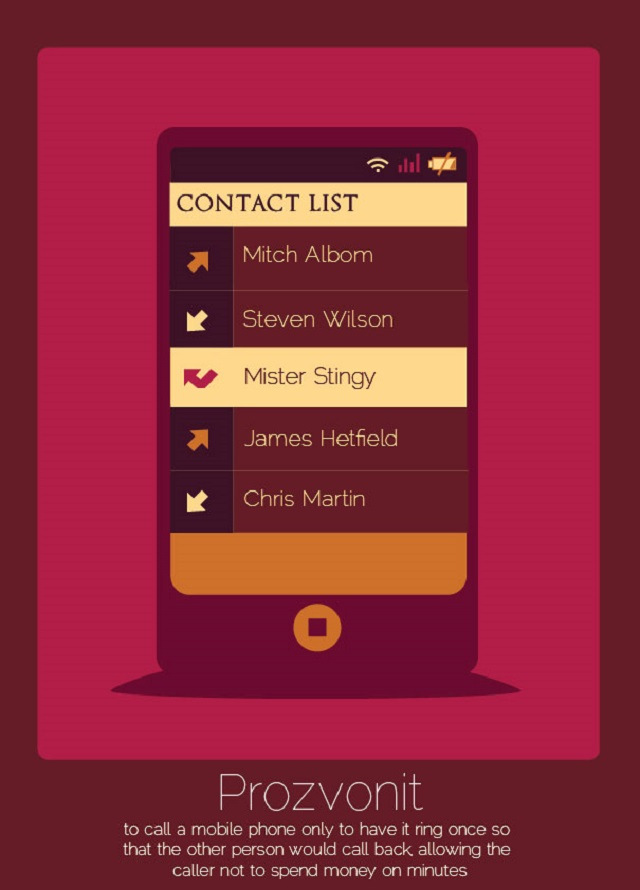 - Prozvonit (checo): llamar a un móvil y solo permitir que suene una vez de manera que la otra persona pueda devolver la llamada, y el primero en marcar no tenga que gastar dinero o minutos.